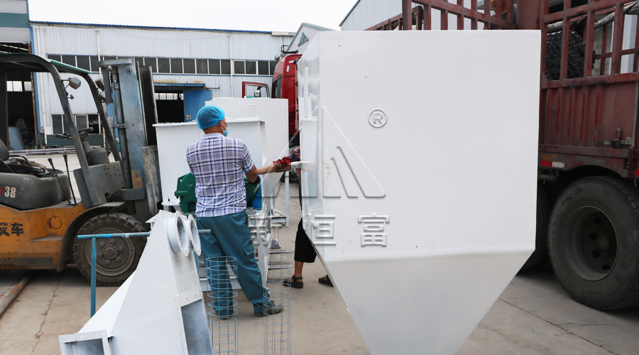 天气炎热,厂区发货却没有因此停歇,此次发往西藏的这套500型卧式螺带机组主要包含水滴式粉碎机,之字形除铁器,卧式螺带混合机,螺旋提升机,自动包装机,待粉碎料仓,成品料仓,待混合料仓,以及粉碎机支架,手动阀门,缓冲斗等。