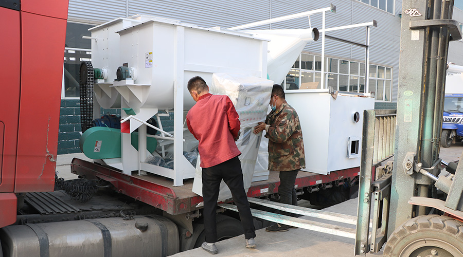 此次发货的主要设备有,8根螺旋提升机,两台粉碎机,两台单轴混合机, 两个碳钢材质的饲料成品仓以及配套的电控柜等其他辅助配件。