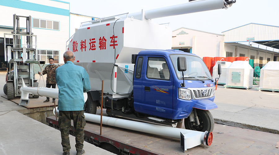 小编了解到,此次发货的两套粉料机组时产半吨到一吨,主要用来加工猪饲料,此外根据客户需求配置的时产3吨全液压无外接电源料塔上料车,靠的是柴油机输出动力驱动,从而将成品料输送到料塔。