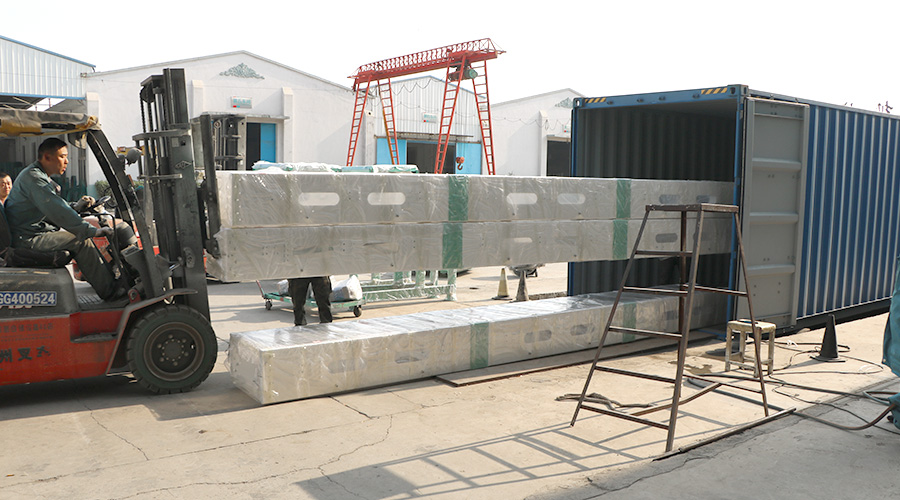 小编了解到,此次发货其实是四套配置设备一起发,由于是集装箱发货,装车过程中不仅对机器长度、宽度有要求,也对集装箱本身承载量不超过28吨有严格控制,单就下图装车的皮带输送机机身来说,工人师傅就折腾了近40分钟。